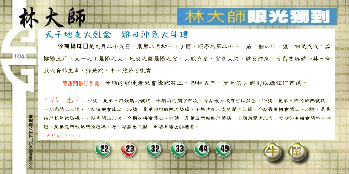 | 主题 :104期:六合皇金句/老总论码/萧公子/林大师/五行夺码/老总信箱截 |