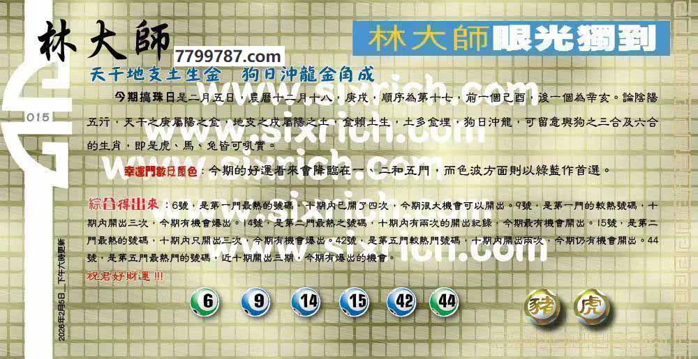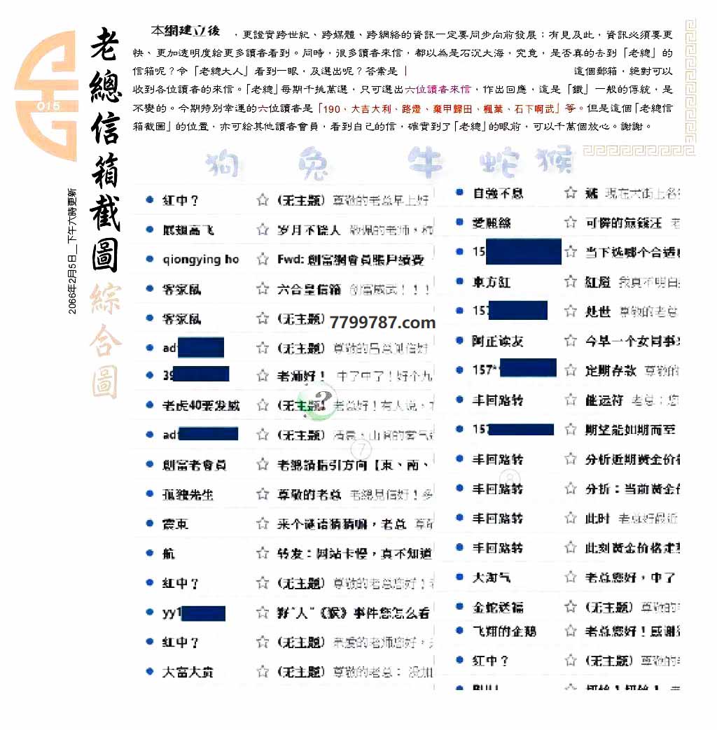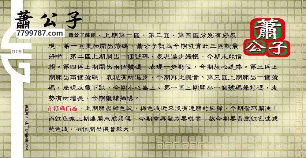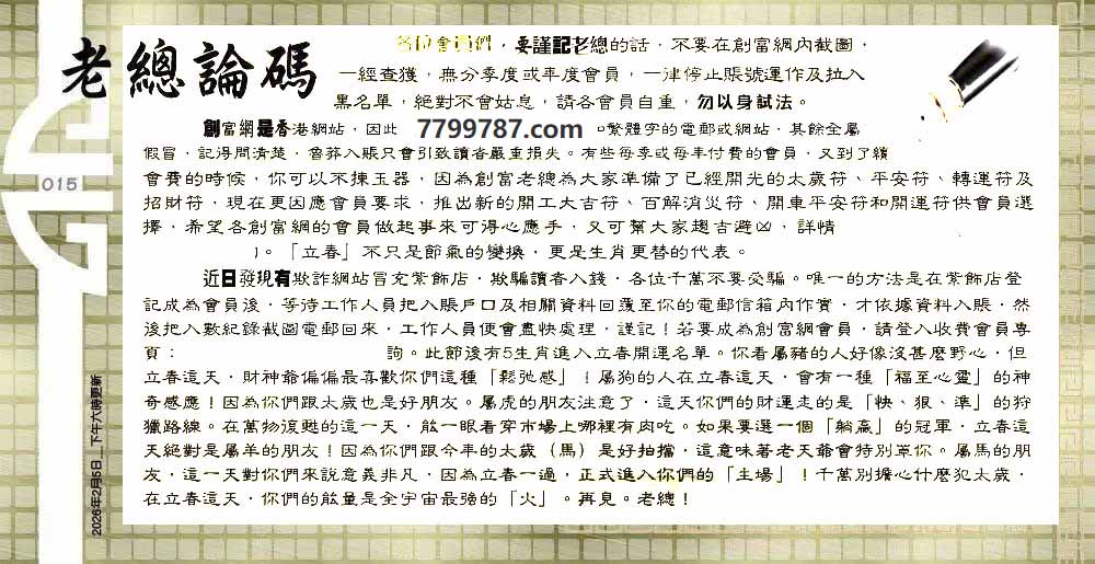 | 主题 :015期:六合皇金句/老总论码/萧公子/林大师/五行夺码/老总信箱截 |