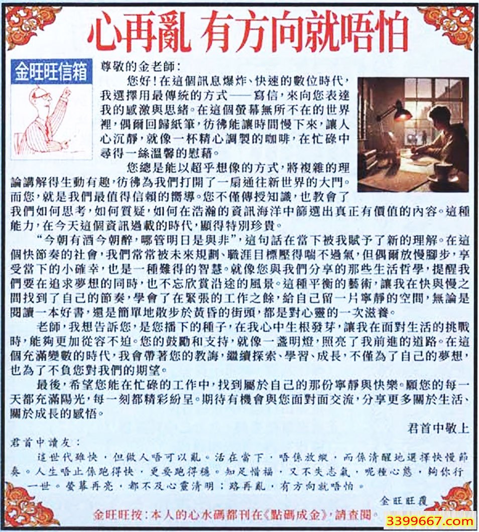 | 主题 :016期:金旺旺信箱彩民推荐→→《心再亂 有方向就唔怕》 |