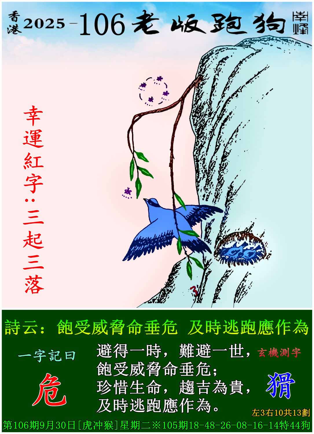 主题 :106期老版跑狗一字記之曰:【危】 玄機測字:《猾》